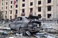Os danos são retratados após o bombardeio de tropas russas no centro de Kharkiv, nordeste da Ucrânia